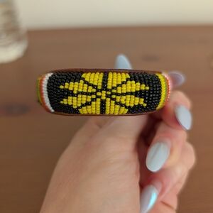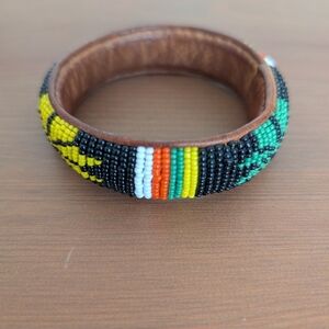 Vibrant Vintage leather beaded bracelet with red, yellow, green and black, and beads. Perfect for adding a pop of color.