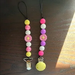 Brighten up your child's accessories with this colorful beaded pacifier clip set. Handmade with BPA free, non toxic silicone beads. Perfect for teething baby’s and to clip soother to baby on the go! All items are new never used handmade!