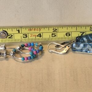 Set of earrings featuring colorful beads and blue glass. Includes star and round bead designs.