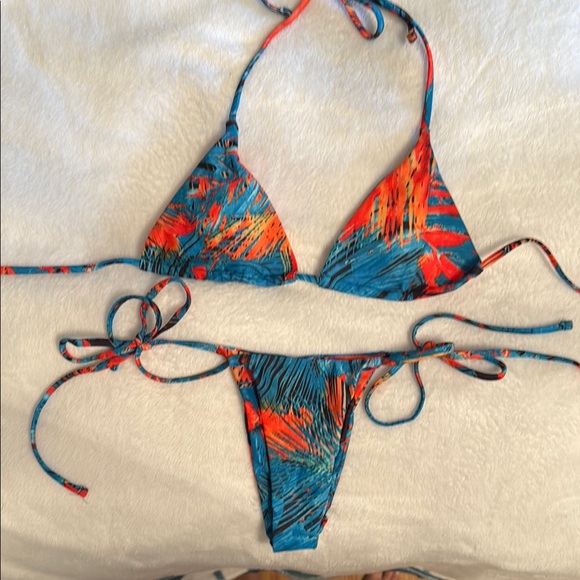 Vibrant bikini set with a striking pattern. Features a mix of blue, red, and orange colors. Perfect for a bold beach look.