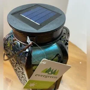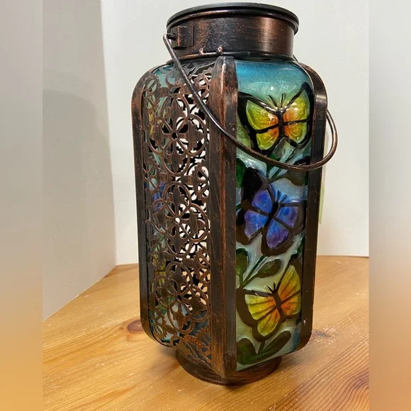 Decorative l.e.d light Lantern with Vibrant Butterfly Designs. Features Intricate Metalwork and Colorful Glass Panels. Brand New w/Tag Never Used.