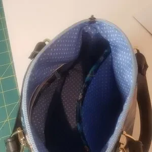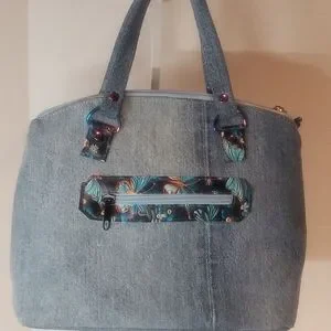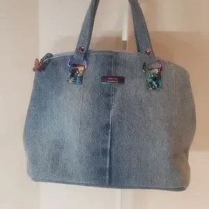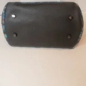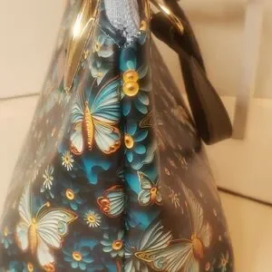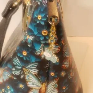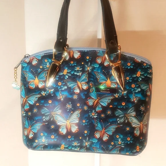This vibrant mini bag features a stunning butterfly print, perfect for adding a pop of color to any outfit. The black handles provide a sleek contrast, making it a versatile accessory for any occasion. Handmade with printed faux leather and cotton. It has a top zipper closure with roomy interior for this mini. Interior also has a slip and zip pocket. Gold and black strap connectors and black feet. A crossbody strap could be add to connectors for crossbody option. " crossbody strap not included" And as always a cow charm. H.H. 12" or 30.5 cm.