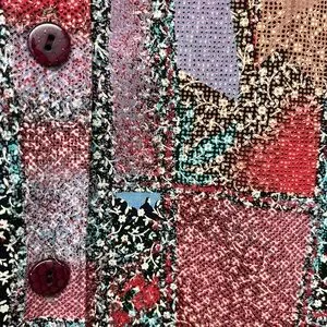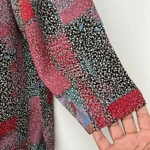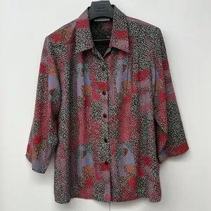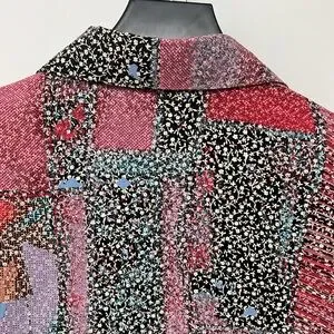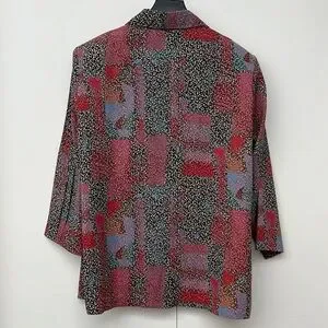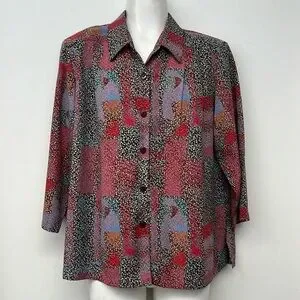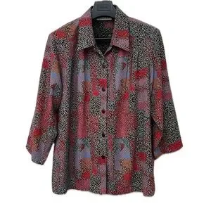 Vibrant button down shirt featuring a mix of red, black, and blue patterns. Perfect for adding a pop of color to your wardrobe.