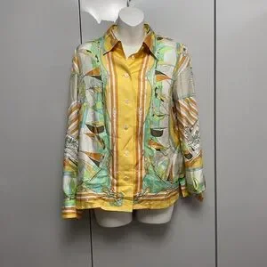 Vibrant button-up shirt with a mix of yellow, green, and orange patterns. Perfect for a bold look.