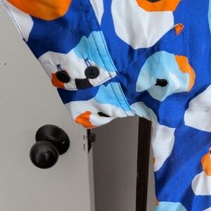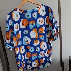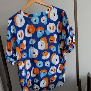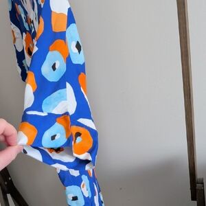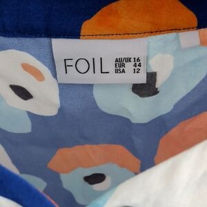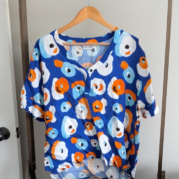 Foil brand. Vibrant button-up shirt with a playful pattern. Features blue, orange, and white colors.