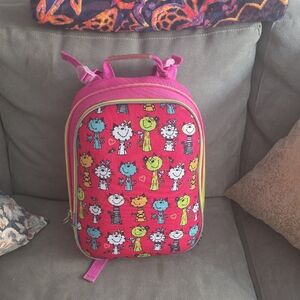 Vibrant backpack with cartoon characters. Features pink, red, and yellow colors. Perfect for kids. small stich problem but it has lots of life still because has another stich under