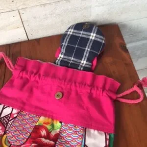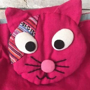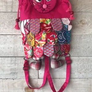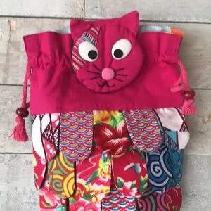 Vibrant cat-themed backpack with a mix of colorful patterns. Features a playful cat face and adjustable straps.