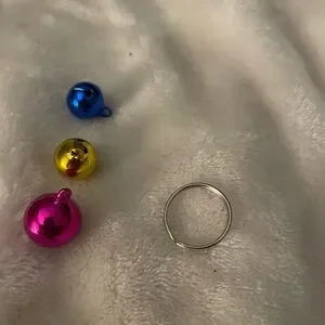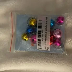 Set of colorful cat collar bells. Includes pink, blue, yellow, and purple bells. Perfect for pet accessories.