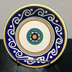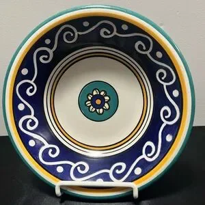 Design Details: The item features vibrant colors, including concentric rings of blue, white, yellow, and teal, with a floral design in the center.