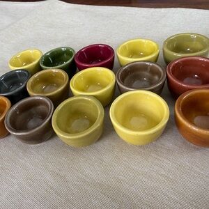 Set of vibrant ceramic mini bowls. Perfect for serving or decor. Includes multiple colors.