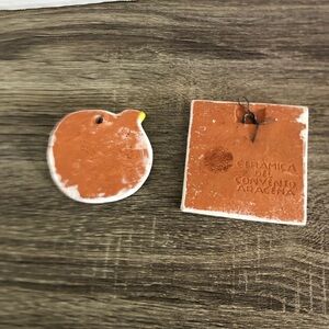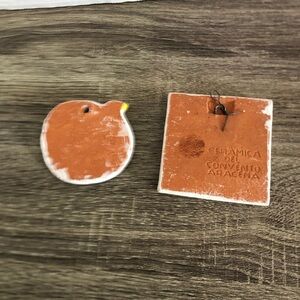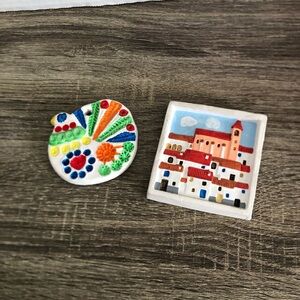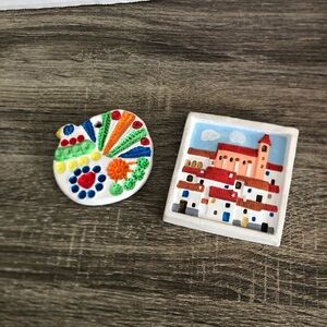 Set of two ceramic art pieces. One features a vibrant color palette design I believe it may be a chicken. The other depicts a charming village scene. Both are marked but one has a deeper stamp.