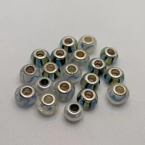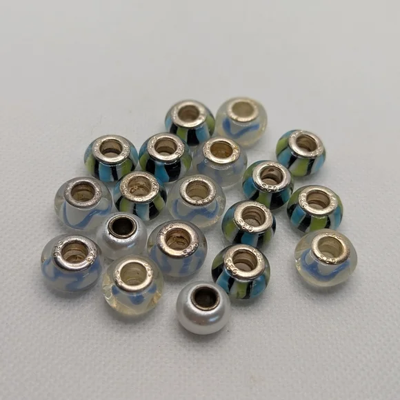 Set of colorful glass beads with blue, green, and silver tones. Perfect for jewelry making. 925 sterling