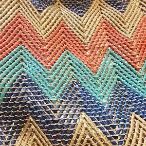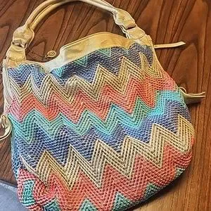 This vibrant women's bag features a striking chevron pattern in multiple colors, perfect for adding a pop of color to any outfit. Upstate Boho look! Little wear on the leather handle.