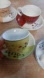 Vibrant set of coffee cups and saucers in red, yellow, and cream. Ideal for coffee enthusiasts.