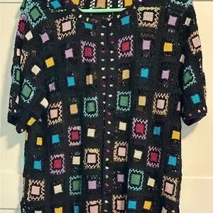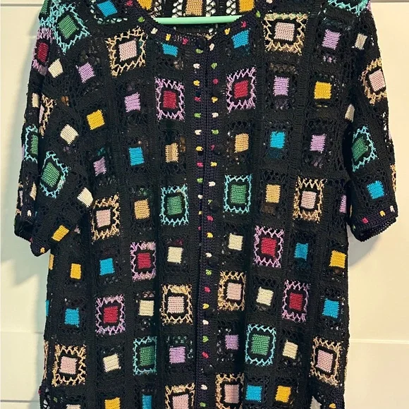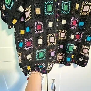 The piece features a black base with colorful geometric crochet patchwork, giving it a unique artistic and detailed look. The fabric is soft with a natural drape, making it lightweight, comfortable, and flattering on different body shapes.