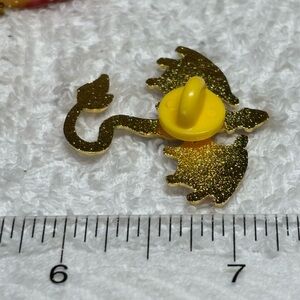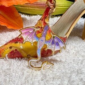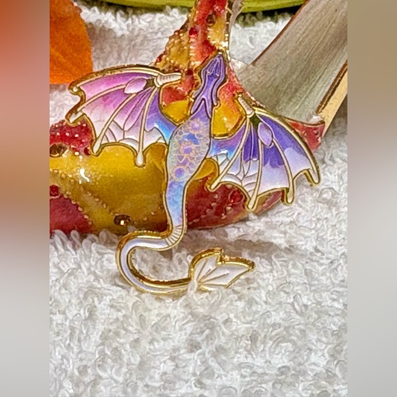 Vibrant dragon enamel pin with purple, pink, and gold hues. Perfect for adding a mystical touch to any outfit.