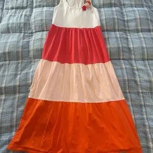 Brighten up your wardrobe with this vibrant dress. Featuring bold red, pink, and orange stripes, it's perfect for any occasion. Comfortable and stylish, this dress is a must-have for your life.