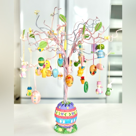 Easter tree with hanging ornaments. Features adorable painted wooden ornaments. Pastel pink, blue, yellow, and green accents. Perfect for festive decor.