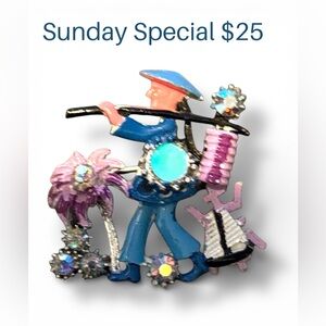 Charming enamel brooch featuring a colorful design with rhinestones. Perfect for adding a touch of whimsy to any outfit. Vintage silver tone Asian diamanté purple and blue enamel Asian water carrier brooch. mid century with enamel and rhinestones. In very good condition. Rollover-clasp. 1.5 x 1.5”.