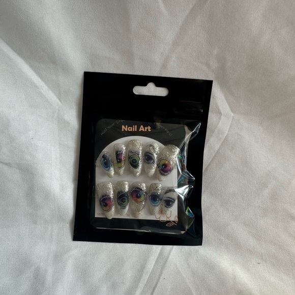 Nail art set with colorful eye designs. Features vibrant colors on each nail.