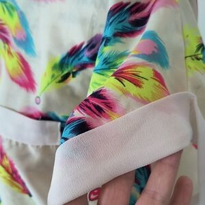 Embrace vibrant style with this colorful feather print women's top. Perfect for adding a pop of color to your wardrobe.