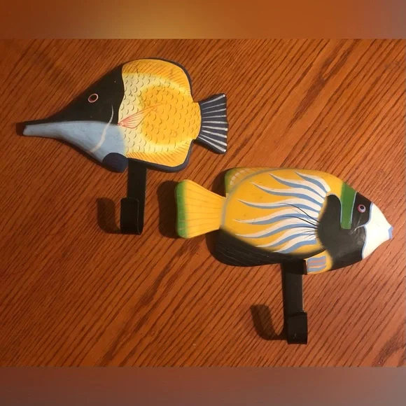 These are perfect for a tropical or nautical theme. Two very unique, vibrant hand-painted wooden fish wall hooks! I’m not sure the type of wood used, but they are very lightweight. Possibly driftwood? The hooks are metal. Both come with pre-installed hooks for easy hanging. They measure approximately 7.5 inches wide and 6.5-7 inches long.