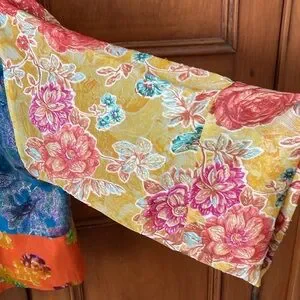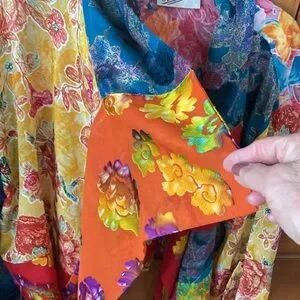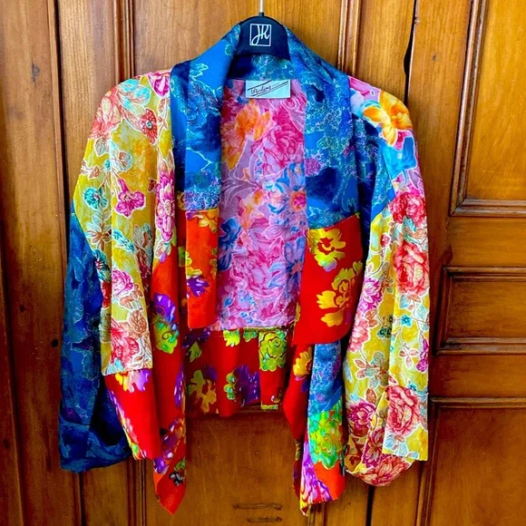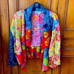 Vibrant jacket with a bold floral design. Features a mix of blue, red, yellow, and pink colors. Perfect for making a statement.