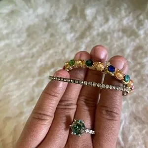 Set of two bracelets. One features colorful gemstones in gold settings. The other is adorned with sparkling rhinestones.
