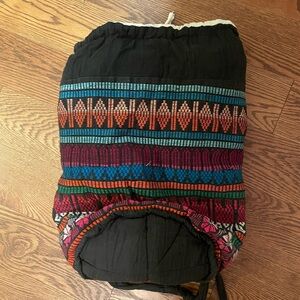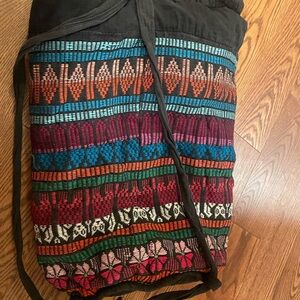Vibrant backpack with geometric patterns. Features black, pink, orange, and blue colors.