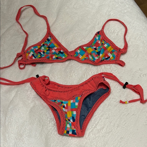 Dive into summer with this vibrant bikini set featuring a colorful geometric pattern. Perfect for making a splash at the beach or pool.
