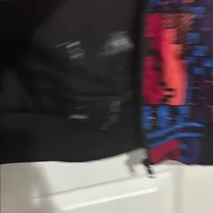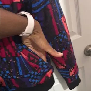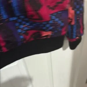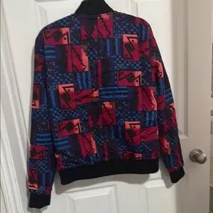 Vibrant bomber jacket with geometric patterns. Features red, blue, and black colors. Perfect for a bold look.