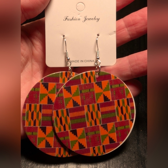 Make a bold and vibrant cultural statement with these stunning African Kente print earrings. Featuring an eye-catching, traditional kente-inspired geometric pattern in bright colors like orange, red, green, and black, these large, round drop earrings are designed to stand out.