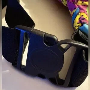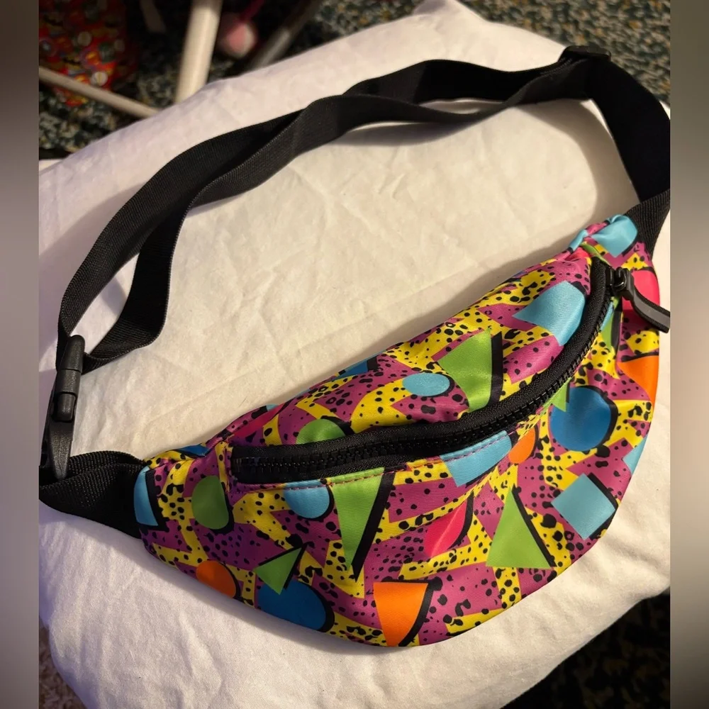 Vibrant vintage fanny pack with geometric shapes. Features a mix of colors including pink, yellow, green, and blue. Has single zipper with one pouch, and adjustable strap. Perfect for adding a pop of color to any outfit.