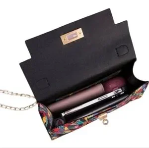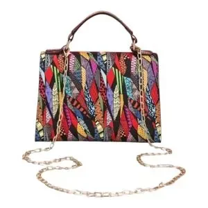Vibrant handbag with a geometric pattern. Features a top handle and chain strap. Perfect for adding a pop of color to any outfit.