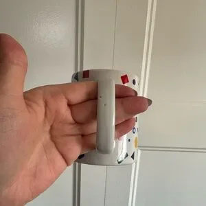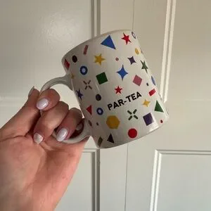 White mug with colorful geometric shapes and 'PAR-TEA' text. Perfect for adding fun to your drinkware collection.