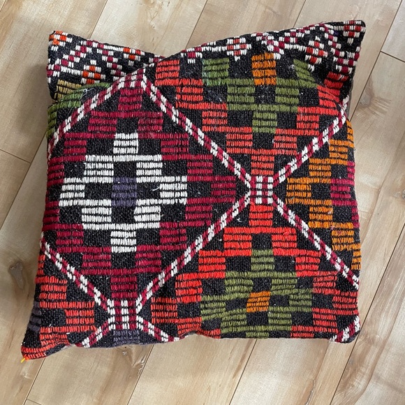 Vibrant pillow with geometric patterns. Features red, green, orange, and black colors. Perfect for adding a pop of color to any room.
