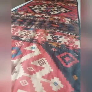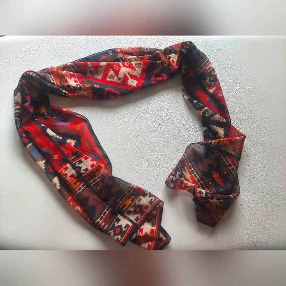 Vibrant scarf with geometric patterns. Features red, black, and cream colors. Perfect for adding a pop of color to any outfit.