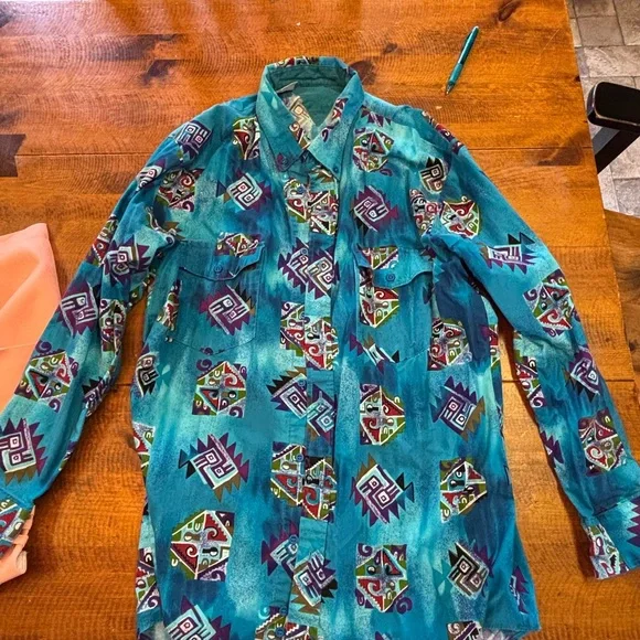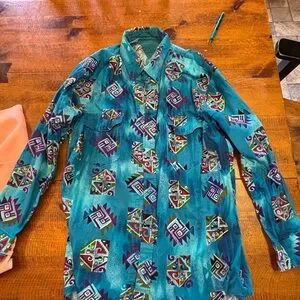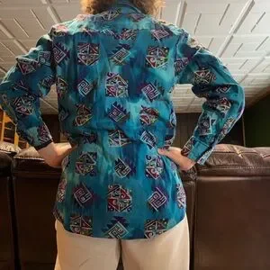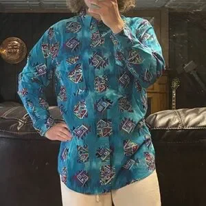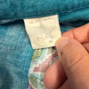Super unique shirt that I LOVED wearing when it fit better!! Tag doesn’t give too much info beyond proudly stating “made in USA” but the pattern is fantastic!