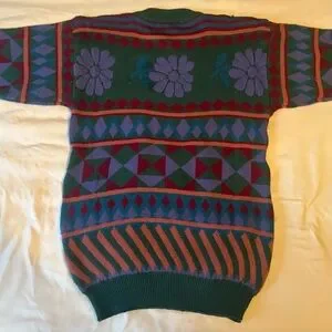 Stay warm and stylish with this vibrant sweater featuring a geometric pattern. Perfect for adding a pop of color to your wardrobe.