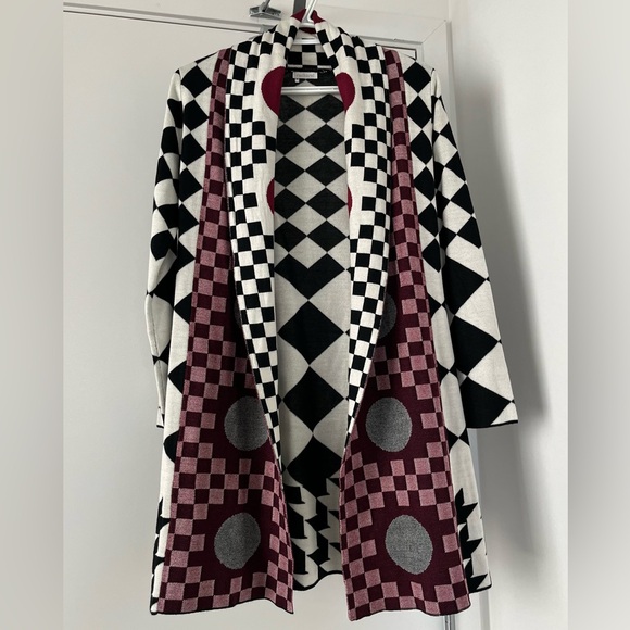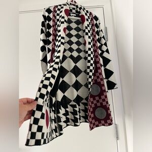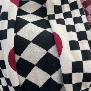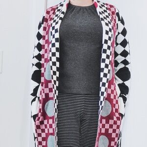 Vibrant cardigan with geometric patterns in red, black, and white. Features checkered and circular designs.