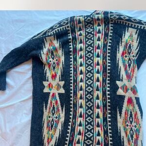 Long cardigan with vibrant geometric patterns. Features a mix of colors on a dark base.