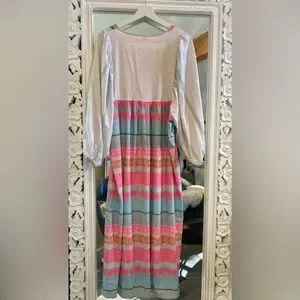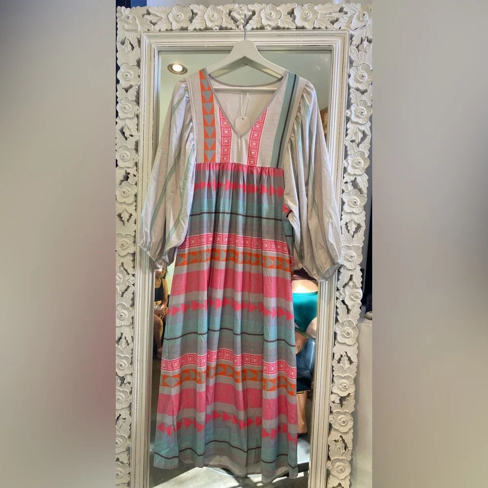 Vibrant dress with geometric patterns. Features pink, orange, and gray colors. Perfect for a bold look. Soft fabric , new but brand is missing .