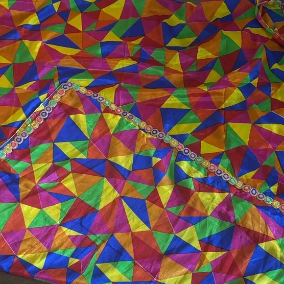 Vibrant chunni with a geometric pattern. Features red, blue, green, yellow, and orange colors. Mirror gotta.