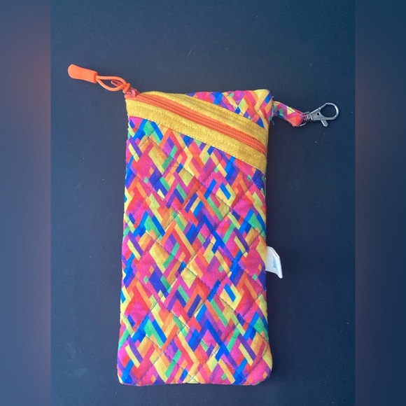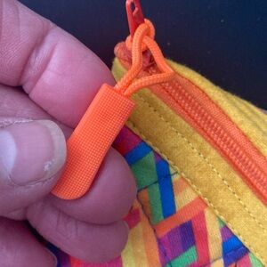 Brighten up your storage with this vibrant geometric patterned pouch. Perfect for organizing small items, this pouch features a colorful design with a convenient zipper closure.