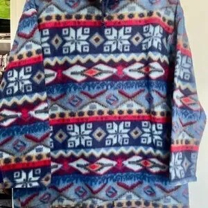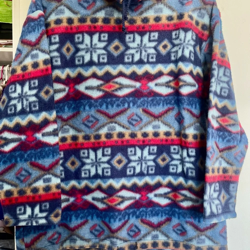 Vibrant pullover with geometric patterns. Features shades of blue, red, and white.