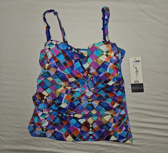 Vibrant tankini top with a geometric pattern. Features a mix of blue, purple, and brown colors.