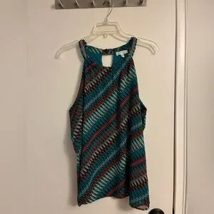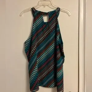 Vibrant sleeveless dressy top with a geometric pattern. Features a mix of teal, red, and black colors.