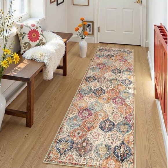 Vibrant runner rug with geometric patterns. Features shades of blue, orange, and cream. Perfect for hallways. 2’ x 5’