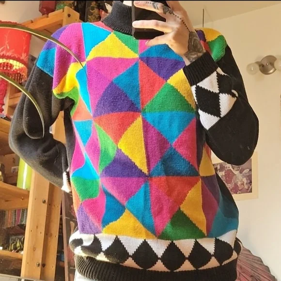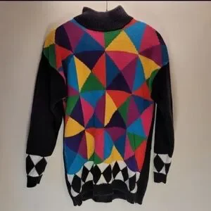 Stand out with this vibrant geometric sweater featuring a bold mix of colors. Perfect for adding a pop of color to your wardrobe.