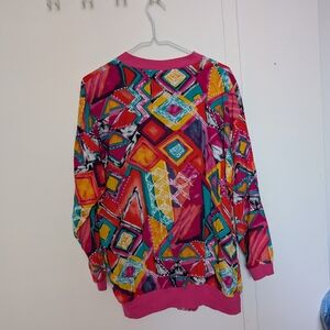 Stand out with this vibrant geometric jacket, perfect for adding a pop of color to any outfit. The bold design features a mix of pink, red, yellow, and green hues, making it a unique addition to your wardrobe.